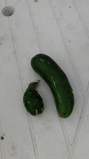 Nu we ons konijnenren hebben is de tuin iets meer verdeeld en weet ik nu wel waar ik mijn mini-moestuin wil. De vierkantemeter moestuin leeggeschept, verplaatst en weer gevuld. Heb ik bijna helemaal alleen gedaan, en ik heb 97665 spinnen en ander vieze beestjes gezien. Ik ben best trots op mezelf. We gaan er volgend jaar weer voor. En meneer knuffelmama deed nog een leuke ontdekking! Ik had in 2 potten 2 komkommerplantjes gezaaid maar toen die te groot waren geworden hebben we die uitgeplant De plantjes hebben het niet overleefd. Dachten we. Nu zagen we op de grond, aan het uiteinde van een dode plant een komkommer liggen! En nog een mini. Super leuk zeg! Dat probeer ik zeker opnieuw volgend jaar, eerst opnieuw zaaien natuurlijk.