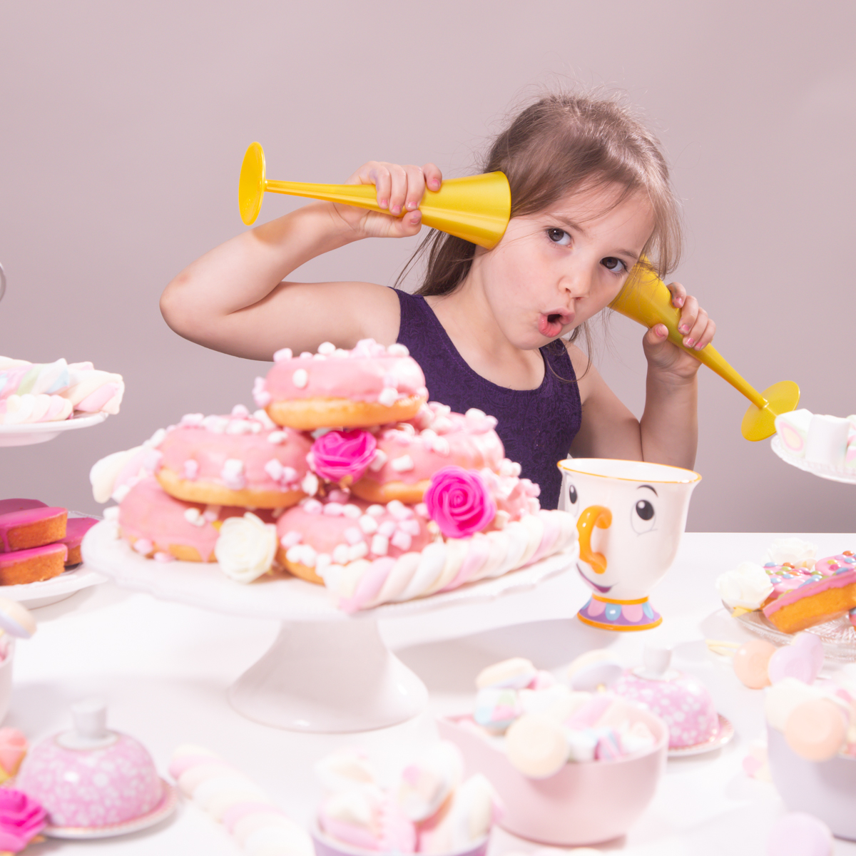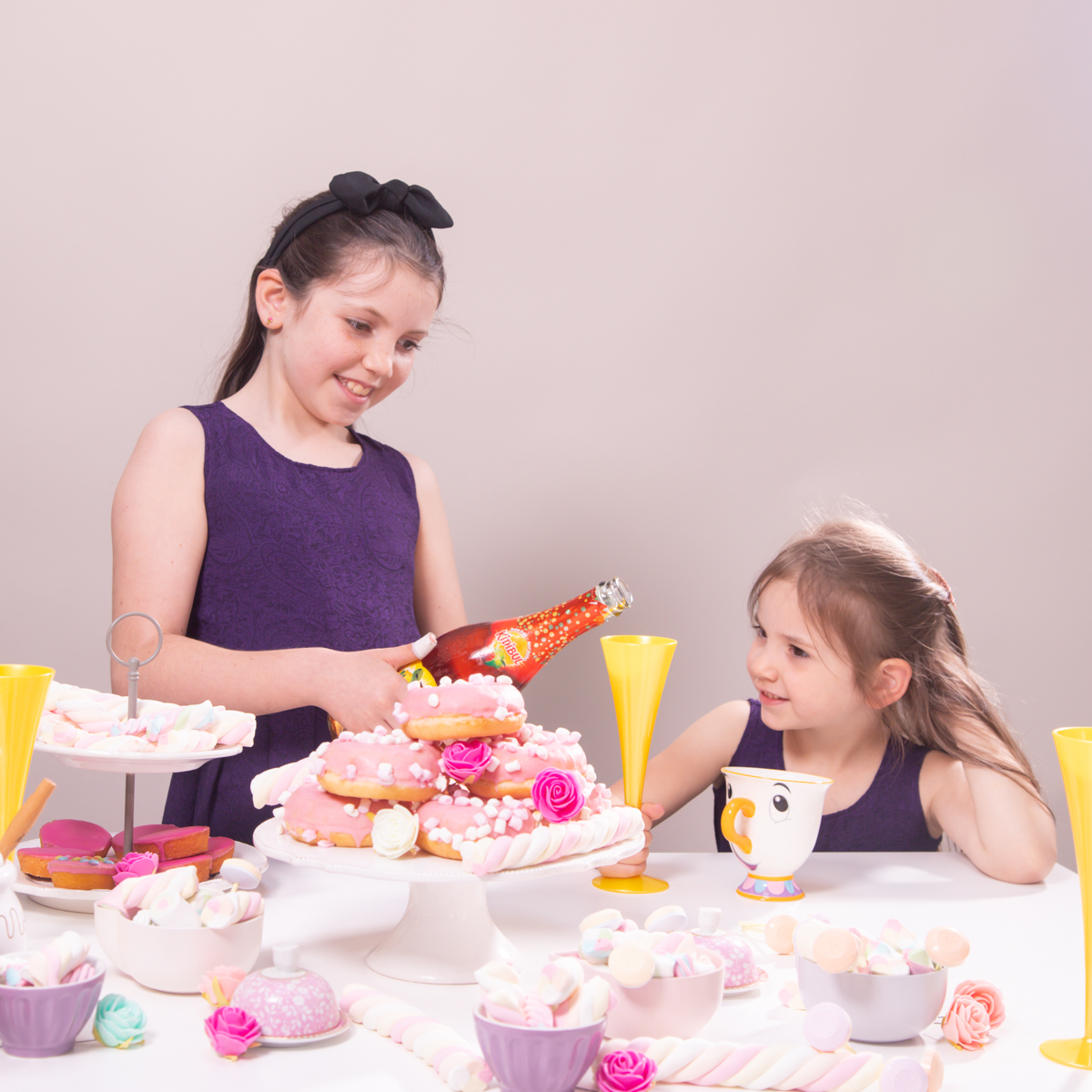 Een niet-verjaardagsfeest mag een volle tafel hebben dus haal je mooiste servies naar boven en zorg voor schaaltjes met verdiepen, taartplateaus op een verhoogje, … een leuke mengeling van feestelijke glazen en mooie theekopjes. Wij werkten ook nog af met roze, mint en witte (nep)bloemen.