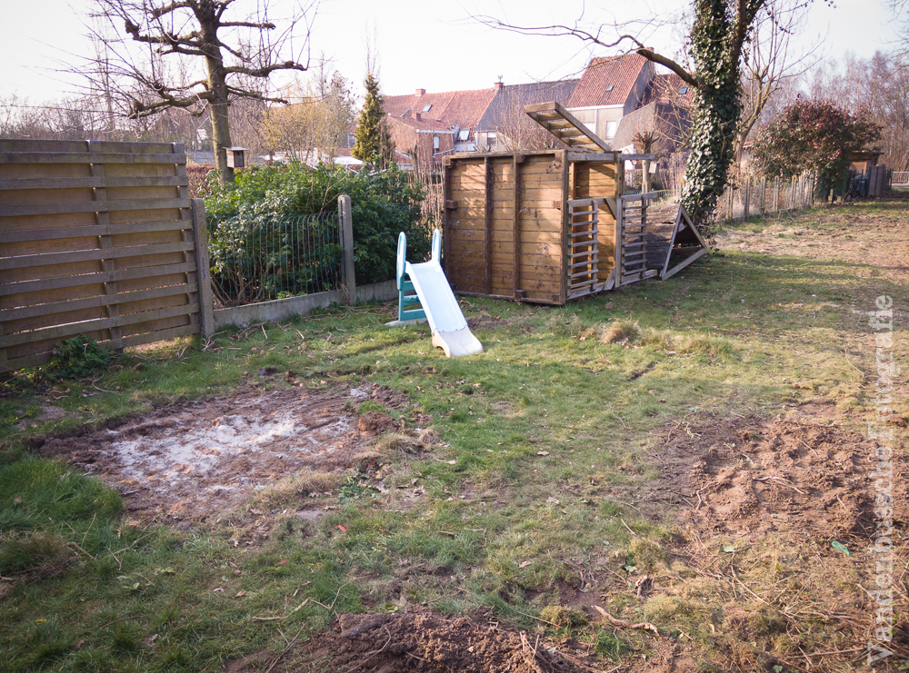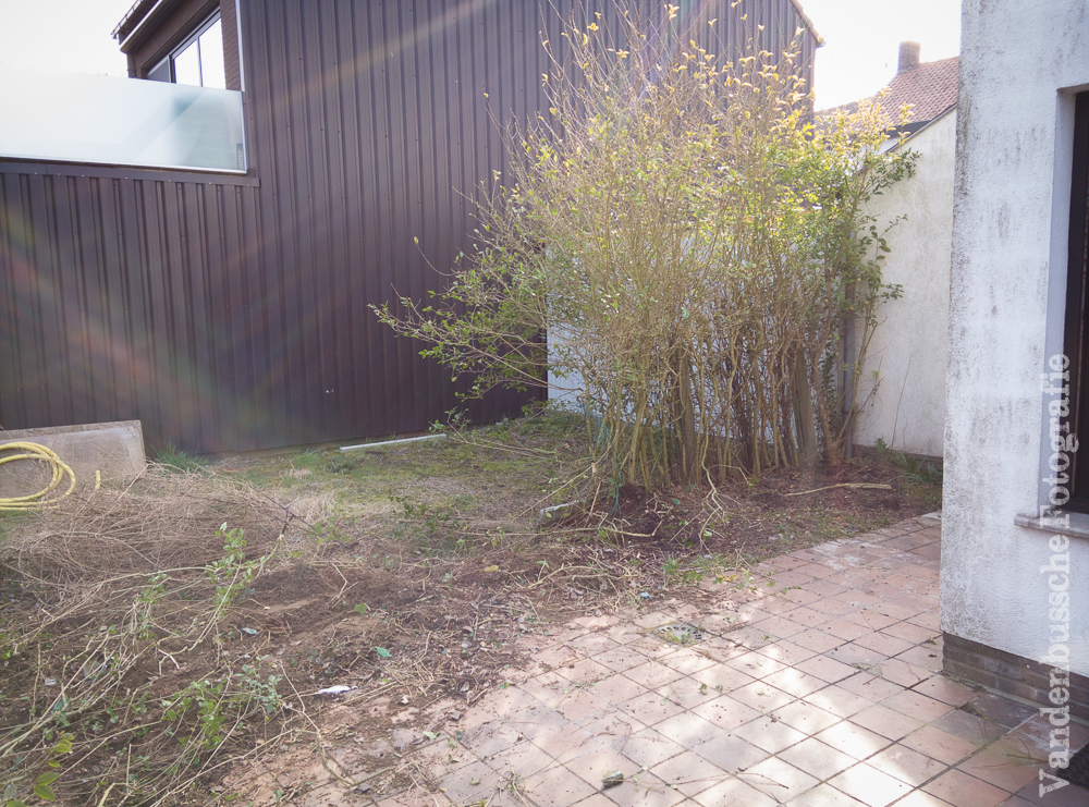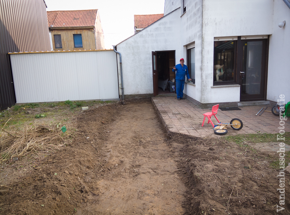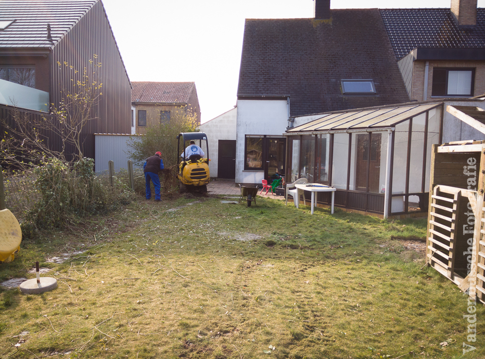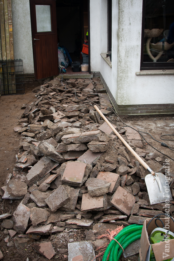 De betonnen omheining werd gesloopt, de struiken gingen eruit, het speelhuisje verplaatst en al een stuk uitgegraven om te kijken hoe het terras was opgebouwd.