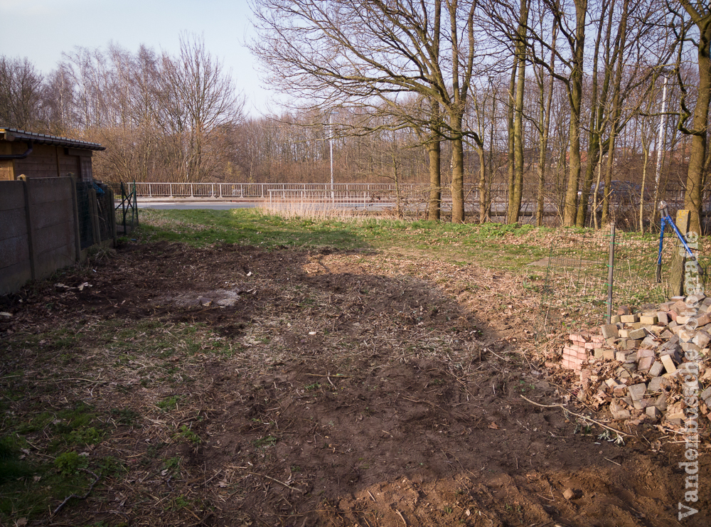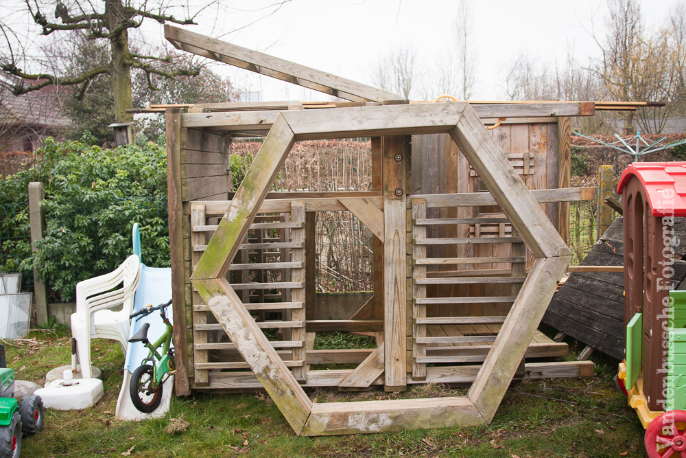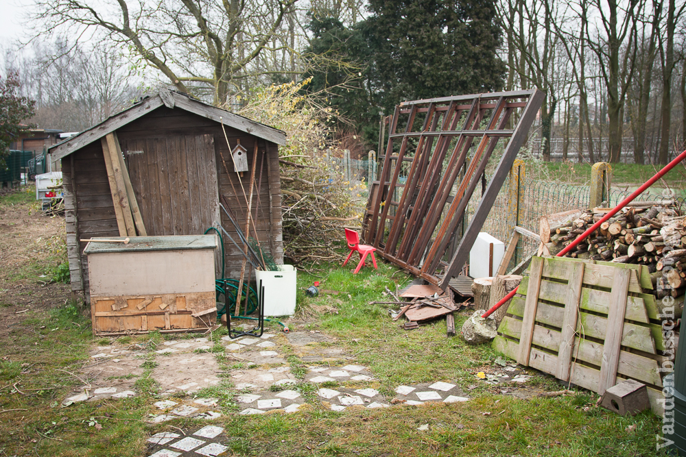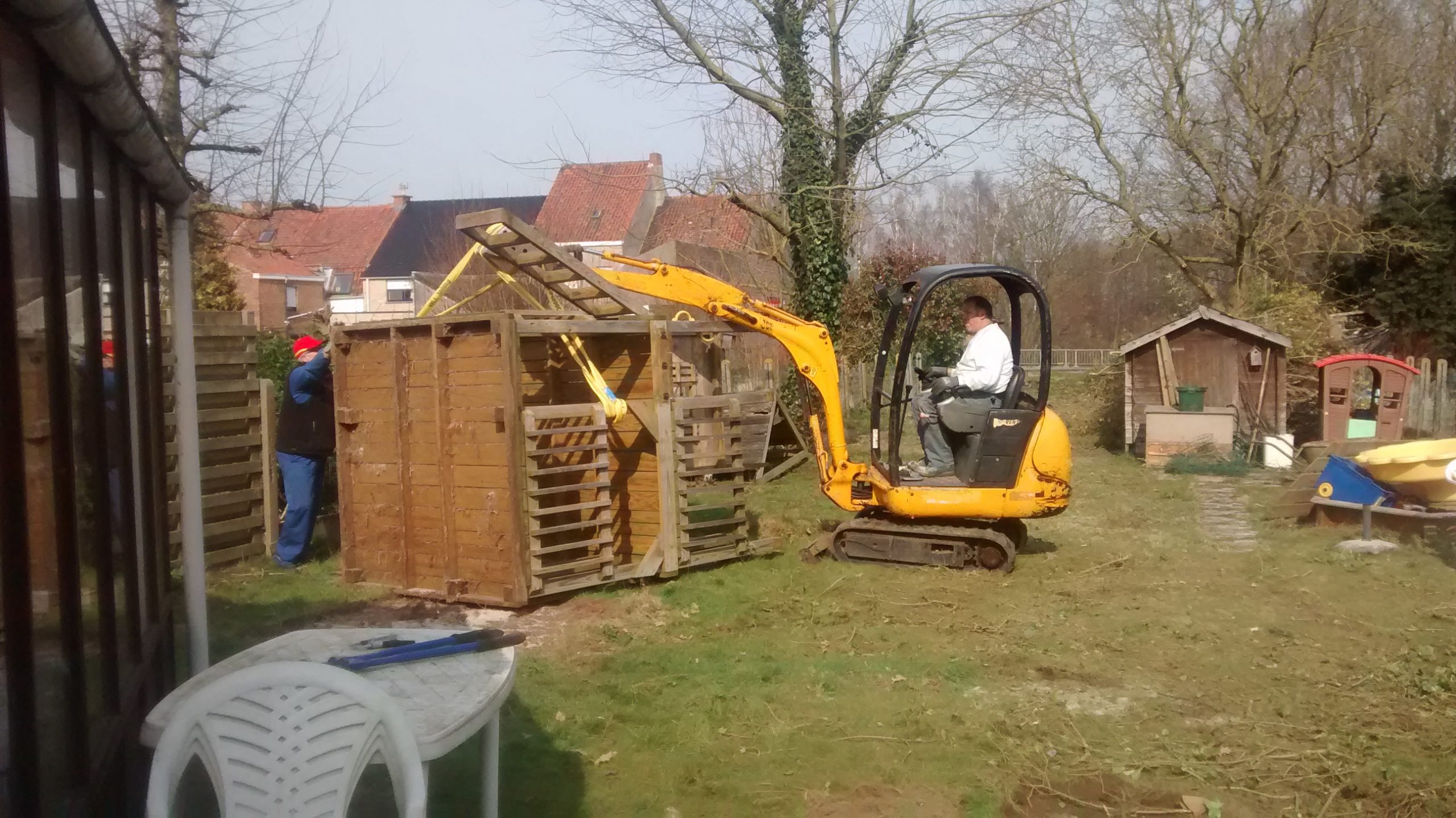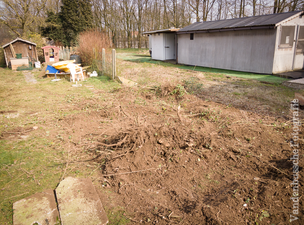 De betonnen omheining werd gesloopt, de struiken gingen eruit, het speelhuisje verplaatst en al een stuk uitgegraven om te kijken hoe het terras was opgebouwd.