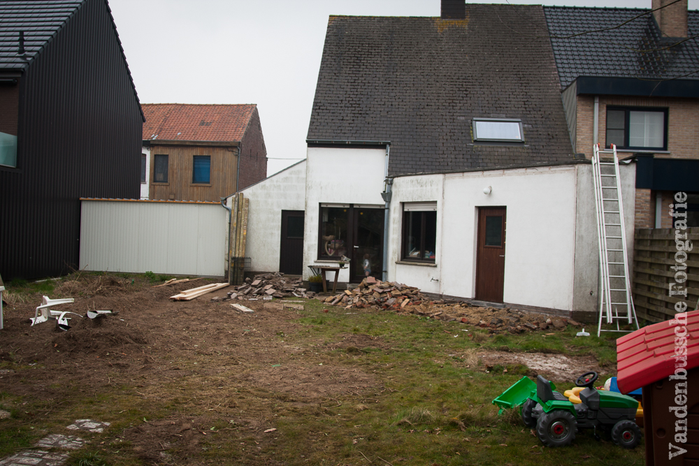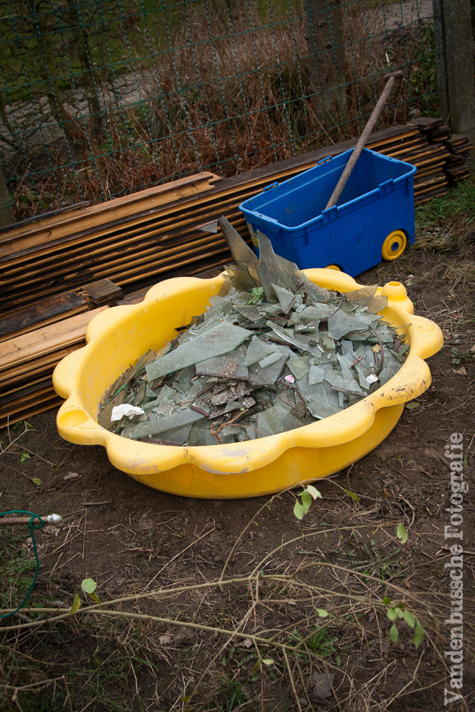 De veranda werd afgebroken en het terras uitgebroken. De veranda werd met zorg ontmanteld zodat er geen glas in het gras zou vallen. Want de kindjes lopen super graag buiten, natuurlijk met schoenen aan tegenwoordig want je weet nooit. Helaas toen ze de veranda wilden kantelen om het dak eruit te halen viel den boel naar beneden, overal glas. Oh en de veranda was heel goed gevloerd, wel 3 keer, dezelfde vloer op elkaar.