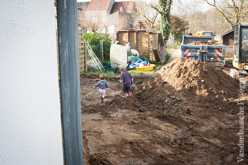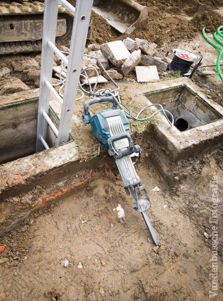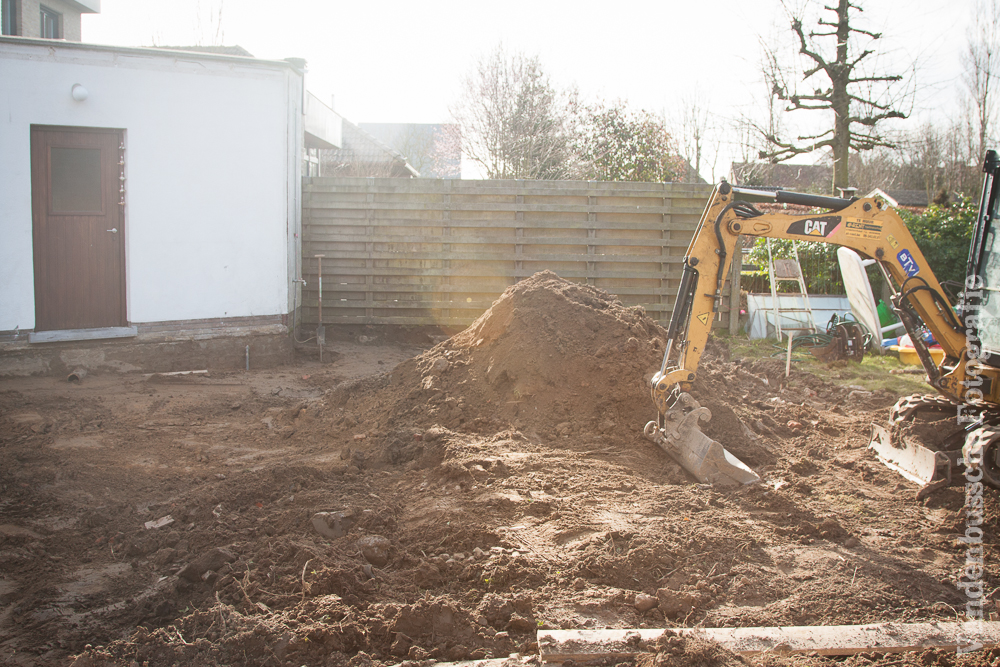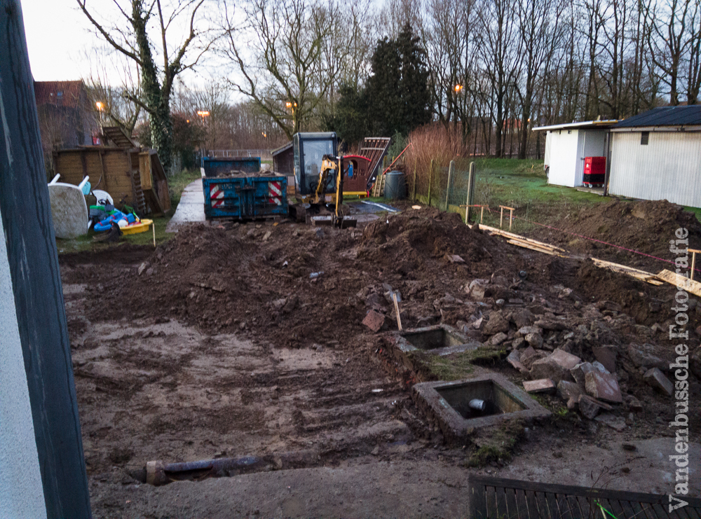 De 2 regenputten werden geleegd, doorboord en opgevuld. Er werd heel wat groen door de hakselaar geduwd. De betonplaat van onder het terras werd helemaal weggehaald en alles werd uitgegraven voor de nieuwe betonplaat.