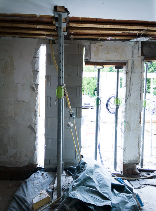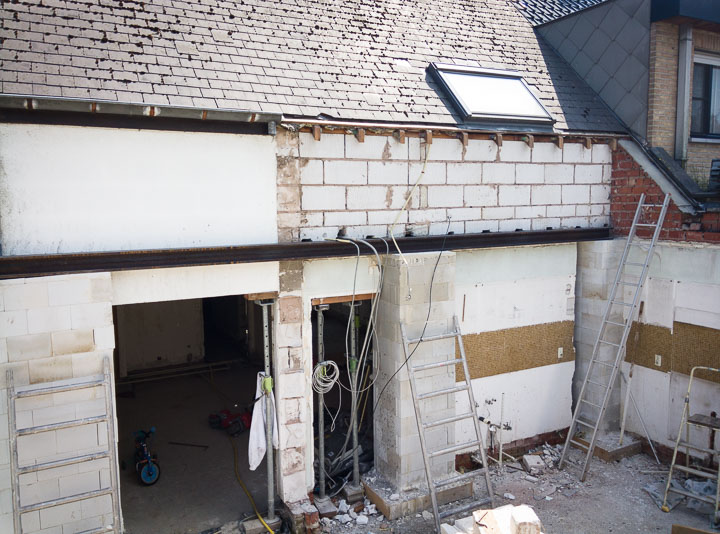 De laatste 2 balken hebben we nog eventjes geparkeerd. Die moeten geplaatst worden op Dé zuil om de bestaande muur (op de verdieping) te ondersteunen. Dat gaat nog een huzarenstukje worden om die (manueel) op hun plaats te krijgen zonder dat alles instort. Ach, zorgen voor later…