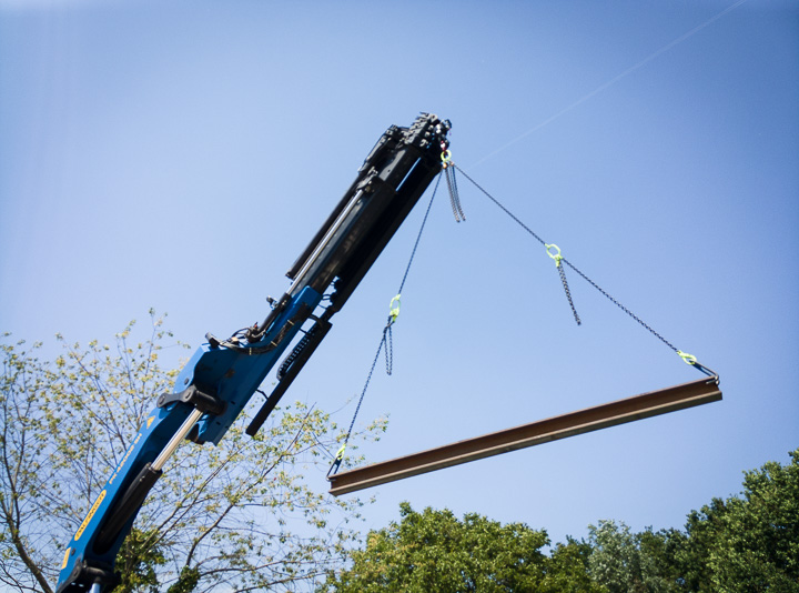 De laatste balk mat slechts 7m en moest geplaatst worden bovenop Dé zuil en zijn collega’s. Er was wat gepuzzel met de stroomkabels die daar uit de muur kwamen, maar uiteindelijk werd ook deze mooi op zijn plaats gelegd.
