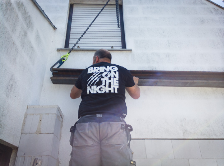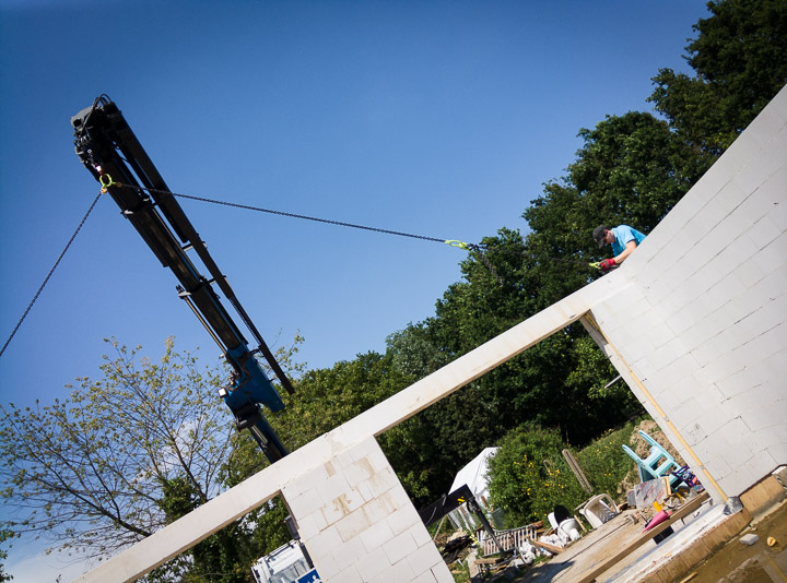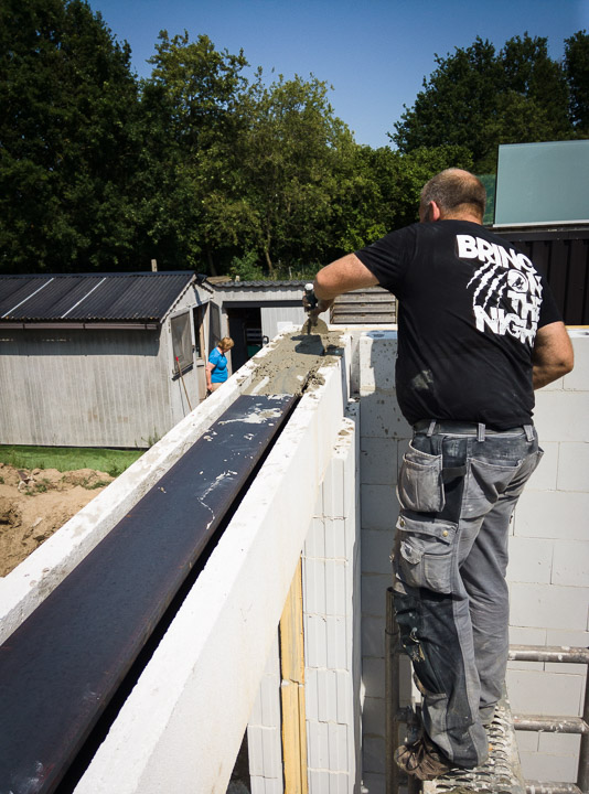 Vervolgens een gevaarte van 9m om bovenop de achtergevel te leggen in de daarvoor voorzien latei. Het geheel werd netjes opgevuld met beton om te zorgen voor extra stevigheid en isolatie. Ondanks zijn omvang was dit een vrij eenvoudige klus.