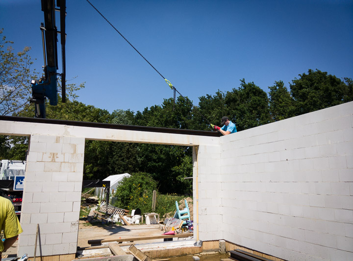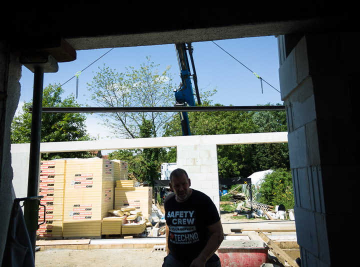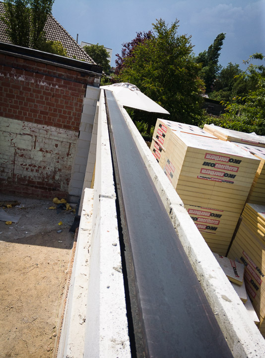 In totaal werden er 5 poutrellen geleverd waarvan we er 3 onmiddelijk konden plaatsen. De eerste balk werd, mede dankzij de handige kraanoperator, in een mum van tijd geplaatst in onze nieuwe berging. Deze balk moest geplaatst worden om het nieuwe dak te ondersteunen, aangezien onze bestaande muren te fragiel zijn om die last te dragen.