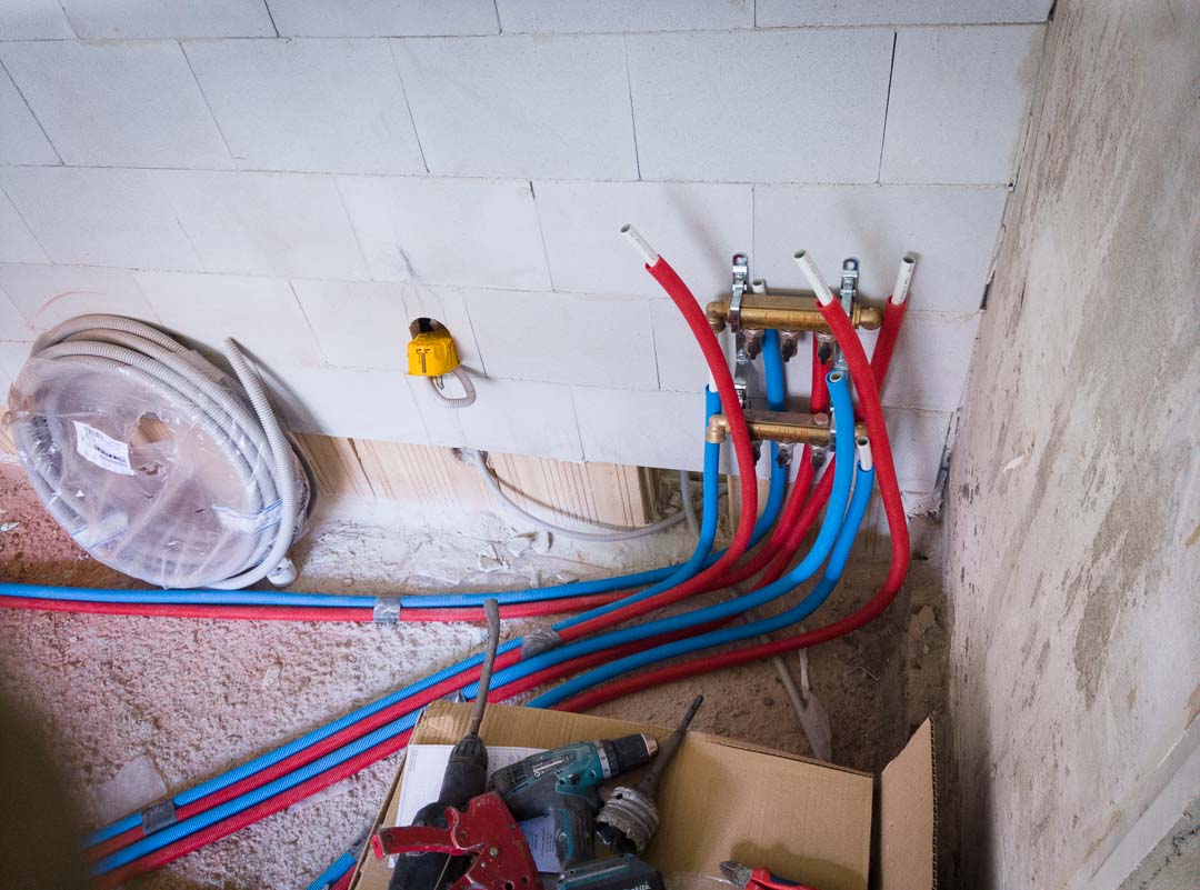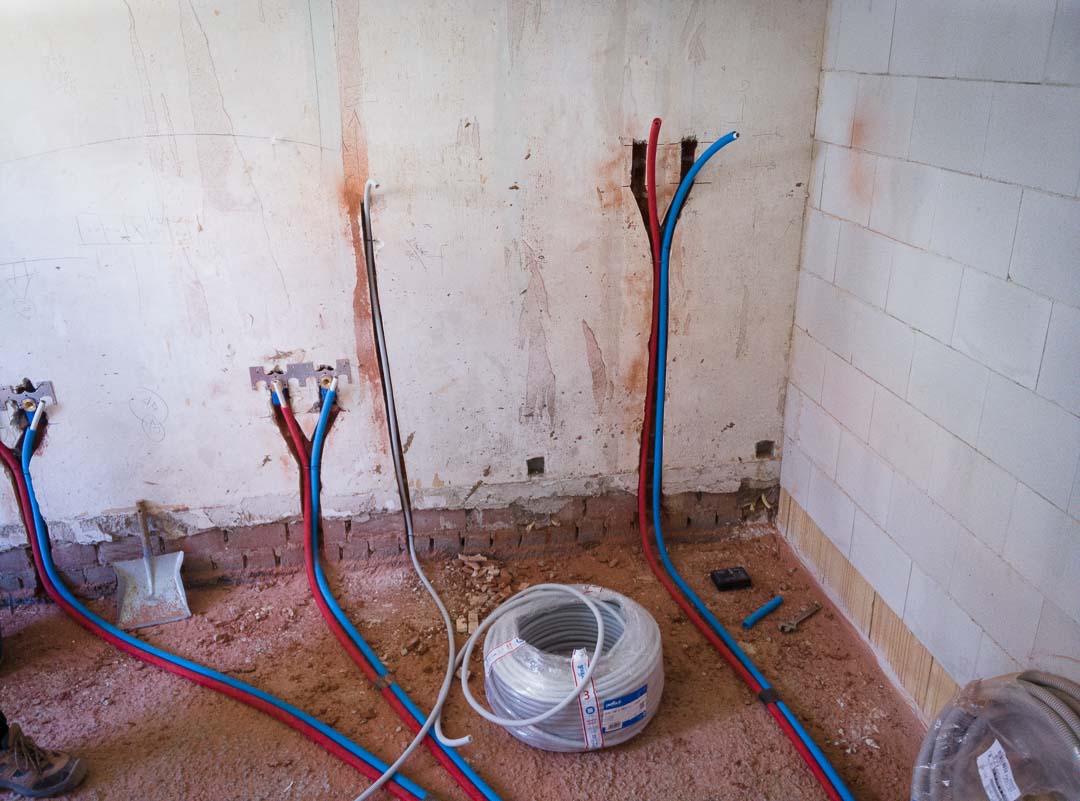 Vorige week hadden we dus de stutten onder het plafond weggehaald en het laatste restje oude vloer verwijderd, dat gat is ondertussen ook mooi volgestort met beton zodat we alvast konden beginnen met het trekken van de waterleidingen in de badkamer.